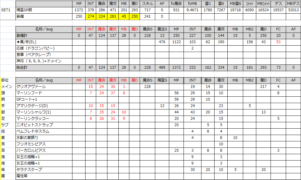 SP胴(装備INT274、魔命224、魔攻281、MB45、魔法D250)