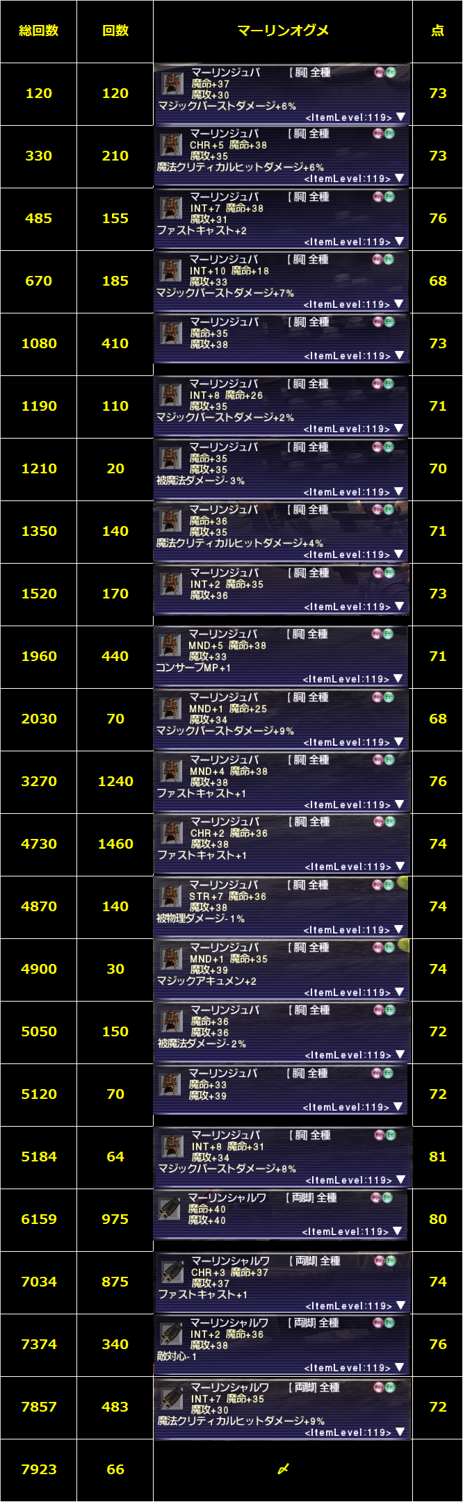 201612月31 マーリンオグメ@白魂石7923個 古い袋【白魂石】891袋@7923個の結果をダイジェストにて。INT、魔命、魔攻、MBの合計70点以上、70弱でもバランスが良くてキープして置きたいなと思えるもの。これが7923個の真実・・・Σ(´д`;)ビル建設結果満足したオグメ結論70点以上を作ったら黒魂石の世界へ進むが吉。 「オーグメント」カテゴリの最新記事 コメント コメント一覧 (4) 1. 李 2017年01月01日 03:18 あけおめです オグメ選択に記録時間加えて1回10秒換算で79230/3600=22.00・・・時間(汗) それでも80点、使ったギルと時間プライスレス(涙) おつかれさまでした・・・ 2. Lute 2017年01月02日 02:10 >李さん 明けましておめでとうございます。 ぽんぽんやっていたので消化ペースはもっと速いのですが、それでも相当かかりましたねぇ。。。 今後は黒石でちょいちょい消化しつつ結果を記録して見たいと思います。 3. A猫 2017年01月31日 10:59 点数というのは、INT 魔攻 魔命 MBなど(いるやつ)の数値の合計ですかと。 そもそも、70点にいかないっ 4. Lute 2017年02月01日 01:35 >A猫さん いるやつの合計です! ハマってますな・・・がんばですよ! コメントフォーム 名前 コメント 評価する リセット リセット 顔 星 投稿する 情報を記憶